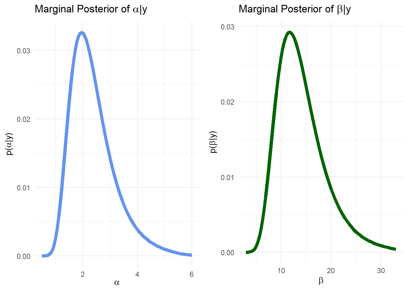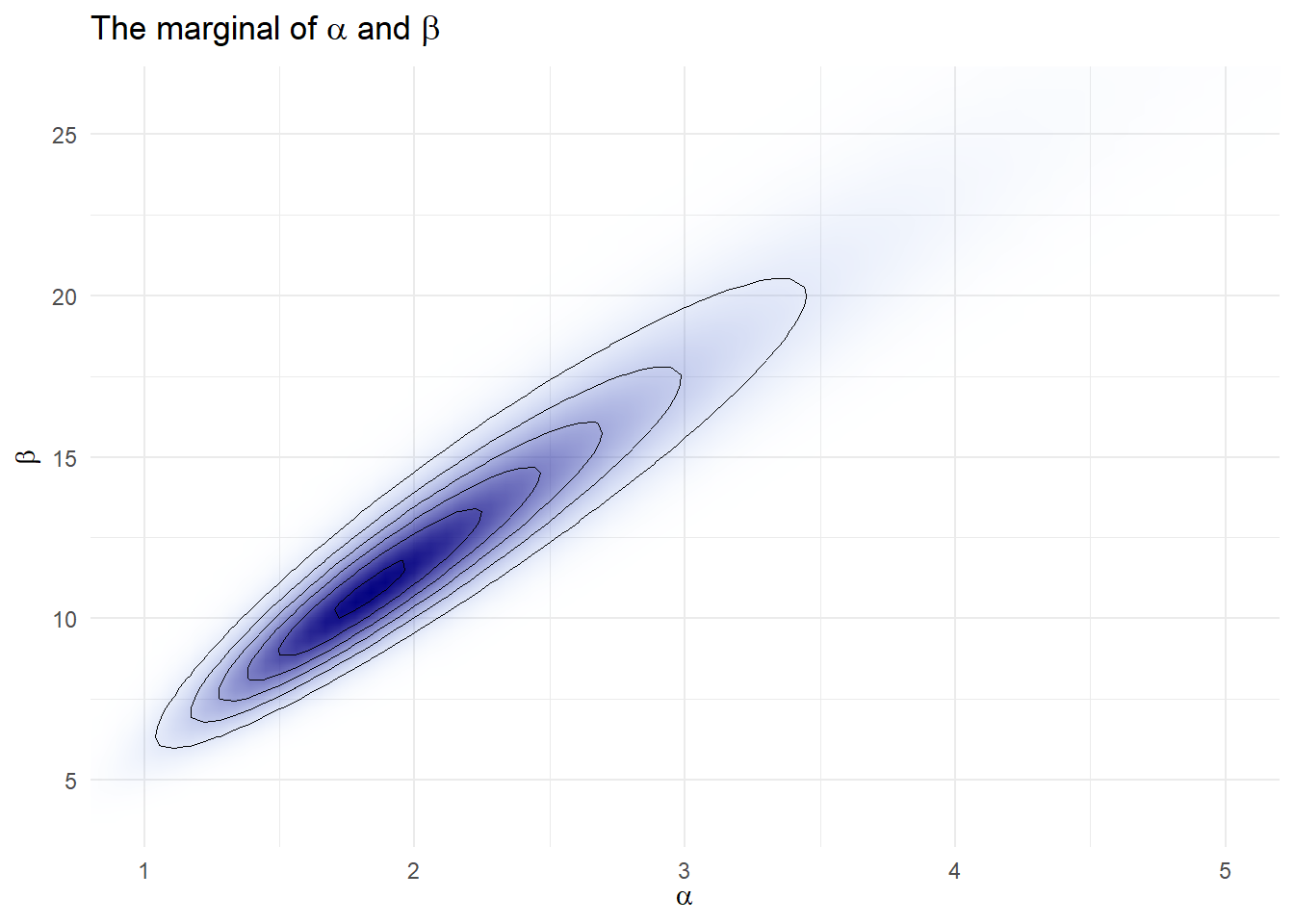 $$\rightarrow p(\theta, \alpha, \beta|y) \propto (\alpha+\beta)^{-\frac{5}{2}} \ \prod_{j=1}^{m}\frac{\Gamma(\alpha+\beta)}{\Gamma(\alpha)\Gamma(\beta)}\theta_j^{\alpha-1}(1-\theta_j)^{\beta-1} \ \prod_{j=1}^{m}\theta_j^{y_j}(1-\theta_j)^{n_j-y_j}$$
