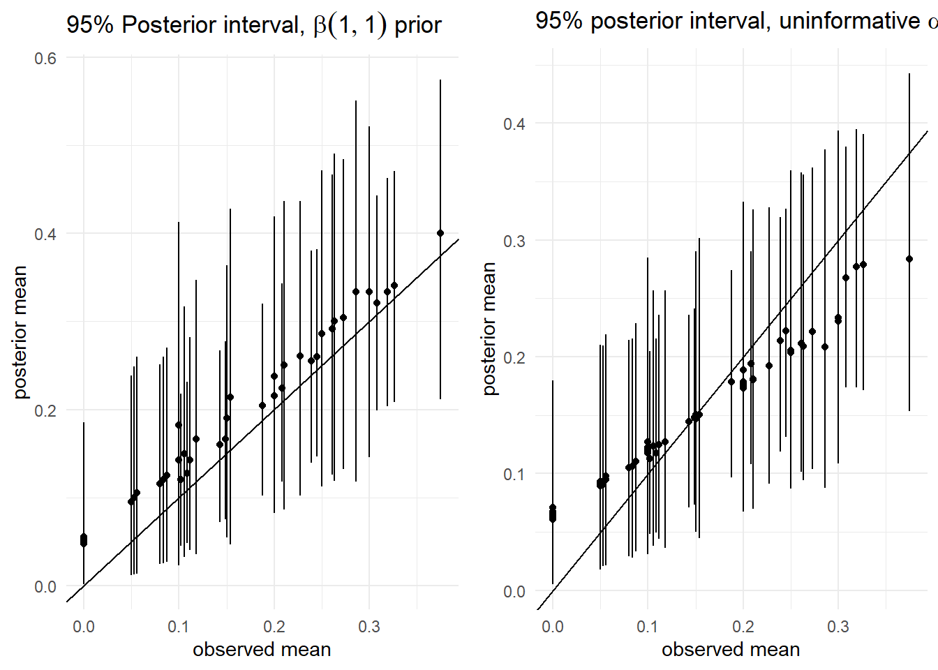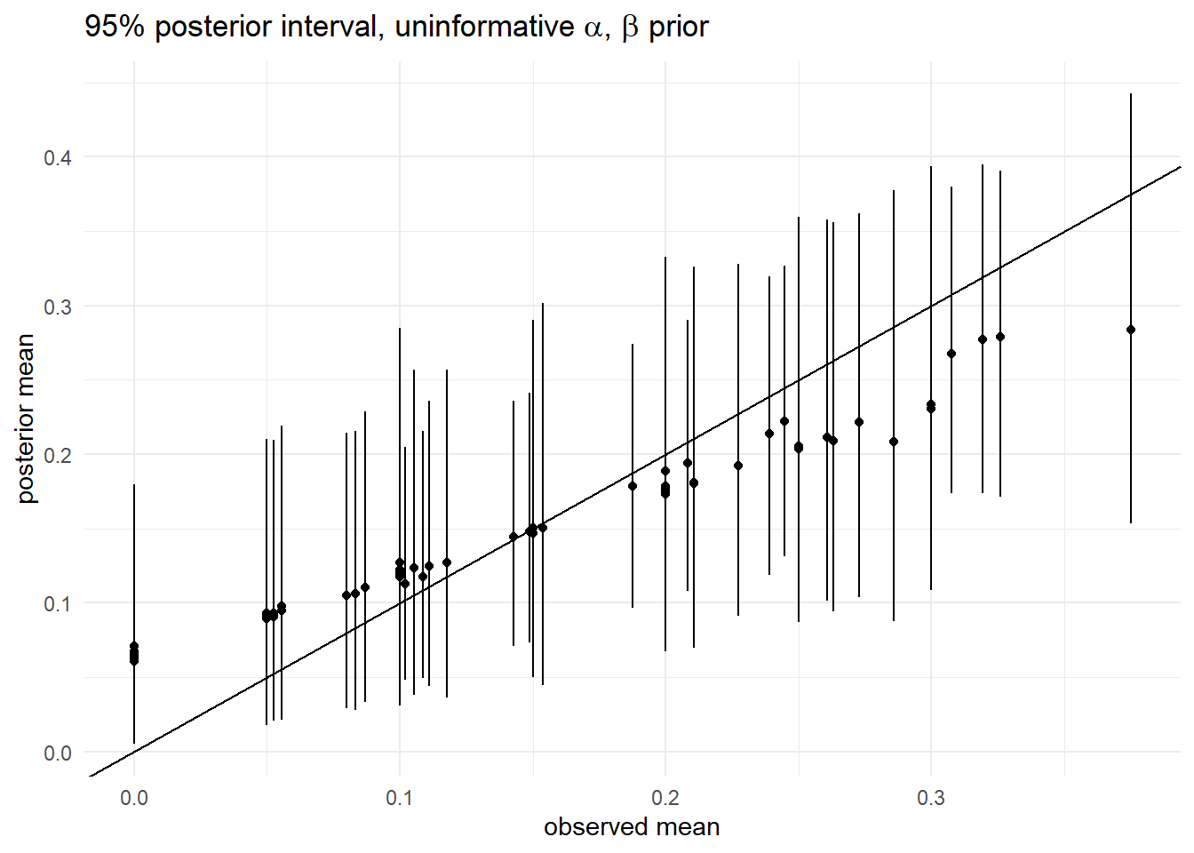 3) 95% posterior interval, uninformative prior($\alpha, \beta$)